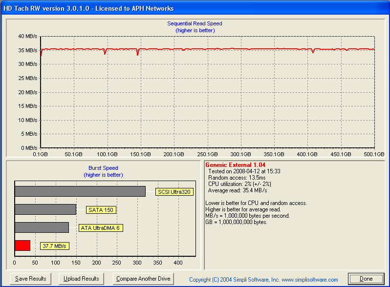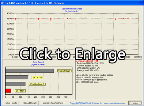 As you can see in our HDTach results above, the performance is held back by the limits of USB 2.0 only -- otherwise the Western Digital AAKS hard drive had a sustained transfer rate beyond maximum USB 2.0 throughout (As compared to maximum SATA performance). The Thermaltake BlacX's SATA to USB bridge performed very well, with an average sustained transfer rate of 37.7MB/s.