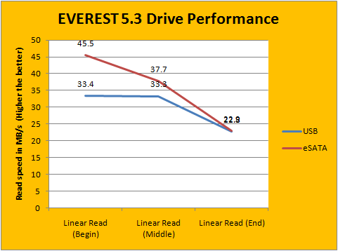 Running EVEREST 5.3's disk benchmark suite with eSATA (Limited to drive performance only) plotted against USB (Limited to drive or interface, whatever is lower), we can clearly see where USB performance hits a wall. Uncapped performance according to EVEREST 5.3 for our Hitachi 2.5" Serial ATA hard drive is 45.5MB/s, 37.7MB/s, and 22.9MB/s for beginning, middle, and end of the drive, respectively; while USB 2.0 in the same read order is 33.4MB/s, 33.3MB/s, and 22.8MB/s, respectively. It's clear where the USB interface limitations are on our graph above -- but 33.4MB/s isn't bad at all as far as the USB controller is concerned.