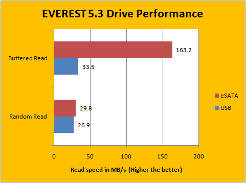 For our buffered read benchmark, again the uncapped eSATA performance is posted at 163.2MB/s -- while USB is again limited to 33.5MB/s, as described earlier. In the random read test, both USB and eSATA recorded similar performance at 26.9MB/s and 29.8MB/s, respectively.
