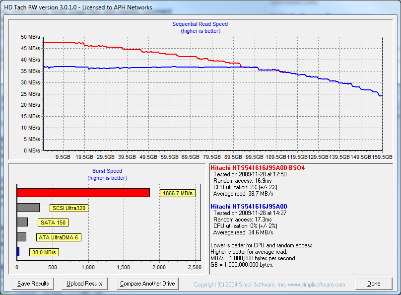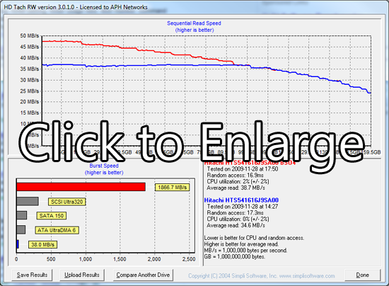 Running our standard HD Tach 3.0.1.0 full read test produced similar results as our EVEREST 5.3 numbers listed earlier. As shown in the graph produced by the software above, we can see that the performance wall of USB is limited to a little over 35MB/s (This is actually dependent on the accessed block size of the benchmarking software as well) with an average read speed of 34.6MB/s at 17.3ms latency. Meanwhile, eSATA's maximum read is approximately 47MB/s; again slightly higher than the EVEREST maximum read result. Average read speed is 38.7MB/s at 16.9ms latency uncapped to serve as a reference to its USB performance. External Serial ATA burst speed is 1866.7MB/s according to HD Tach -- unsurprisingly, burst speed recorded over USB is compared at 38.0MB/s due to interface limitations.