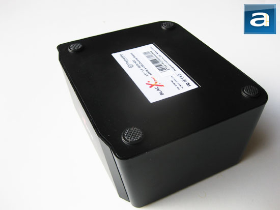 A spring held push-down cover is at the top of each identical drive bay, with a gap opening at the top left corner to accommodate 2.5" SATA HDD in a vertical position. I found that there is a slight SATA connector alignment issue with my 2.5" hard drives, and the fit could be a little snugger -- so the hard drive won't wobble around when it's inserted. Standard 3.5" desktop hard drives are inserted with the door pressed down as you insert the hard drive into the slot. Quite an interesting design in my opinion to have the ability to accommodate hard disk drives of both sizes as its predecessor features. Rounded off in front -- which cleverly acts as a power button when pressed down -- is an array of two blue LEDs to indicate power and activity of the docked hard drives; each LED labeled accordingly. The blue LEDs blink when there's hard drive activity, and stays on when it's idling. It's a much better design than having the power button at the back seen in the original BlacX, but for some reason both LEDs light up regardless of you having a drive in the respective bay or not.