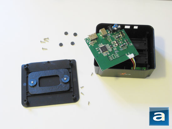 Removing the four 'Solid State Grip' modules held onto the base by adhesives reveals four screws. Unscrewing them disconnects the base from its shell, as shown in the photo above. A small piece of iron is attached to the base cover for physical stability; but the stability of the BlacX Duet is not as good as the original BlacX in this regard -- because they've decided to use a smaller piece of iron. A simple circuit board that provides all the necessary connections resides inside the Thermaltake hard drive docking station. The SATA to USB controller used on the BlacX Duet is a JMicron JMB352 High-Speed USB & SATA II Combo to Dual SATA II RAID Bridge. Specifications of the JMB352 are listed below, as obtained from the manufacturer's website: