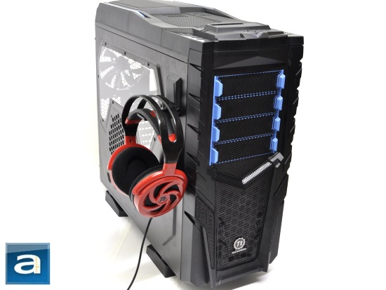 Taking a quick glance at the side of the Thermaltake Chaser MK-1, we can further see the design elements found on the case, as well as a few nifty features that are not seen very often. First off would be the combat headset holder. I have first seen this feature on the Thermaltake Level 10 GT, and quite frankly, such an addition to a chassis is brilliant. Especially for a gaming chassis -- generally, and most often bought by gamers and used for gaming -- one would most probably indulge in the peripheral market which includes your standard headset for the most efficient and effective headshot "pwnage". One small flaw would be that such a design may look ugly in one's eyes. But with a decent headset hanging from the side of your chassis, let's just say it makes your setup look all the more intense; and intensity is good for gaming. Further down the side, you will find a transparent side window for great internal viewing pleasure, and below that, a high airflow mesh vent to give further airflow for your VGA setup. I personally loathe side vents, because I never use them, and leaving them open creates a point of entry for dust. Even if one decides to spend the money to purchase a 3-way SLI or CrossFireX setup, I still believe that an intake side vent would just disrupt the airflow already created from the front intake fan(s) and back exterior exhaust fan. In this sense, I wish Thermaltake would allow the option to purchase a Chaser MK-1 with a full window without the side vent.