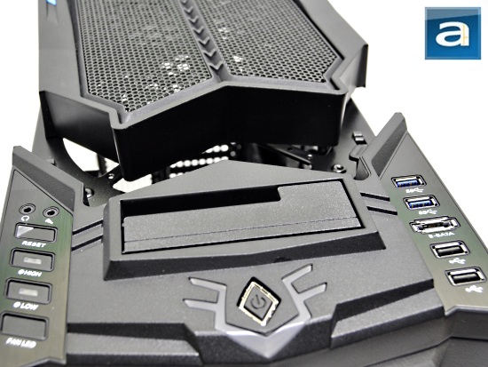 What is very interesting about the Thermaltake Chaser MK-1 would be the front panel connections. According to Thermaltake, this is the area of which they refer to as the "Command Center". What is the Command Center? Well, think of this section as the bridge found on a ship, in which one will be able to control the entire chassis to their heart's content. First off, found at the very center of the connections panel is the power button shaped like a diamond, with the power LED designed around the button in a stylish manner. The power LED itself is blue. To the right of the power button are two USB 2.0 ports, one eSATA connection, followed by an additional two USB 3.0 ports. To the left of the power button lays a set of controls that allows one to have almost complete control over the Chaser MK-1's features. The first thing on the list is a LED control button that allows one to cycle through the LEDs found on the two provided 200mm fans at the top and at the front. There are a total of six LED modes in the entire cycle, which we will discuss in further detail later. Above the fan LED control button are two fan controller speed buttons. This is to control the fan speeds of the two 200mm fans with the options of either high or low. Both buttons are illuminated by a blue LED for one to distinguish which fan speed has been chosen. The reset button is found after that, with a red HDD LED indicator at the corner of the key. Lastly, we have our onboard 3.5mm microphone and headphone jacks to complete the entire arrangement. The Thermaltake Chaser MK-1 features a HDD docking station just above the power button that can fit both 3.5" HDDs and 2.5" drives. With all these features and front panel options provided on the Chaser MK-1, no one can really complain at the sheer amount that is provided. One noticeable problem I have found during my testing is the power button is too easy to press down. On occasion, I have found myself accidentally powering down my system because I brushed my hand over it, or have simply leaned on it.