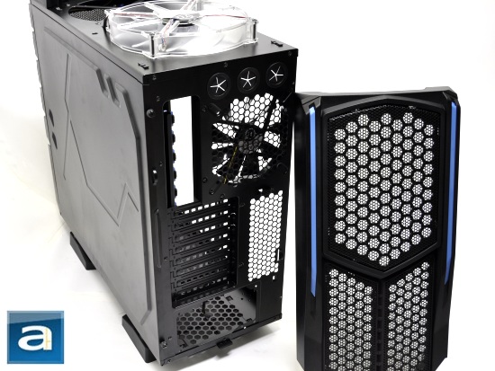 At the back of the Thermaltake Chaser MK-1 is a fairly standard layout. Since the chassis utilizes a bottom mounted power supply unit, the power supply hole is found at the bottom of the unit. Above that is a set of eight expansion slots, which can accommodate pretty much any ATX setup. These expansion slots allow air to flow through them, which is nice. Above the expansion slots, one will find the I/O shield opening for the motherboard I/O shield. To the right of that is a hexagonal stamped fan vent for the 140mm exhaust turbo-fan. The exhaust fan will rotate up to 1000 RPM, and should be way more than sufficient in handling heat exhaust. Just above the fan is an array of three pre-drilled and pre-fitted water cooling holes for those who want to use external water cooling.
