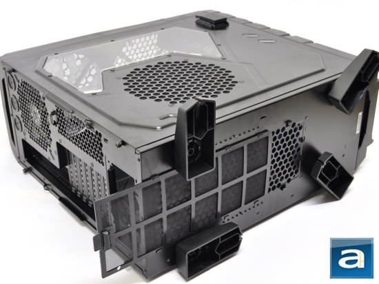 Much like the front bezel, the top panel is made mostly out of plastic and metal mesh. I would have liked to see more air filters in this area of the case. The finer mesh will be able to provide good protection against dust, but will not stop the finer dust particles from entering through the top two fan holes.