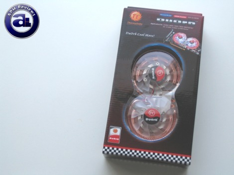 Our review unit of Thermaltake's DuOrb VGA cooler came in retail packaging, as usual from products from Thermaltake sent to us. With a red and chestnut color scheme, the approach taken by Thermaltake for its retail implements a tall vertically oriented design; with a center window cut and shaped to display the front face of the Thermaltake DuOrb itself behind a PET shell. Across the front is the slogan "DuOrb Cool More"; initially I was wondering why this caption is so familiar -- possibly in connotation to Intel's dual core slogans ("Dual core. Do more").