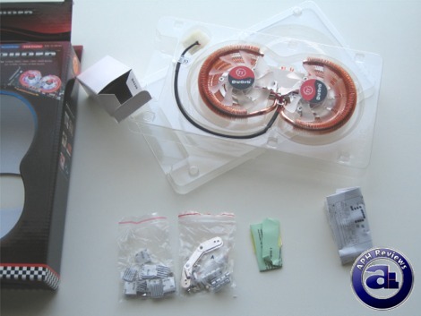 Out of the box, you will get the Thermaltake DuOrb itself, along with a plethora of mounting accessories and component heatsinks. Sliding out the PET shell from the box reveals two zipped bags of mounting accessories. Included mounting accessories allow you to mount the Thermaltake DuOrb on various ATI and NVIDIA graphics cards; an installation poster combined with instructions in various languages to direct the user on how and what accessories are to use in order to properly mount the DuOrb on corresponding graphics cards.