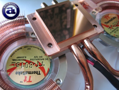The Thermaltake DuOrb is constructed entirely out of copper for the heat dissipation segments. The copper base is designed with two copper heatpipes leading away from it; carrying the heat in different directions -- one right, one left -- since the Thermaltake DuOrb is like two heatsinks stuck together.