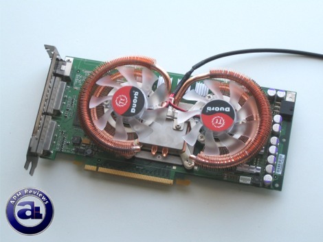 The finished product. The Thermaltake DuOrb is now installed on our test 8800GTS; covering a good portion of the unit. The design of the Thermaltake DuOrb draws air over the entire card through the heatsinks, which proves to be very efficient to cool the entire card -- especially in drawing air over the component heatsinks. Additionally, the Thermaltake DuOrb is quite light due to the low amount of copper used -- the fans are used primarily to dissipate the heat away quicky. Another major advantage is that it occupies no more space than a standard 8800GTS cooler does.