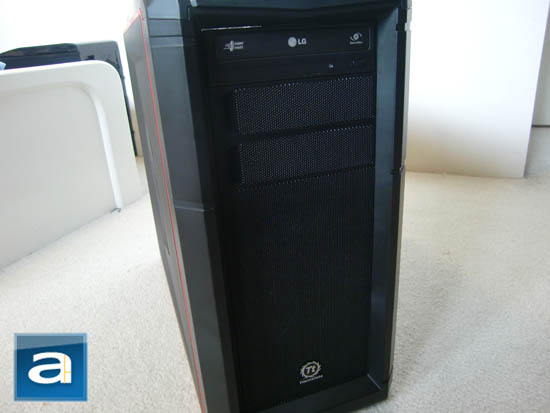 The side panels are lined with the trademark red trim of Thermaltake's Element Series. The top as well as the left and right side panels of the case are made with black SECC. At the front, we have plastic along the edges, metal mesh for most of the front bezel, and three 5.25" drive bay covers at the top. The front drive bay covers are all located at the top; with the rest of the Element G's front covered with a single piece of metal mesh. The Thermaltake logo is located at the bottom. The metal mesh provides a good resistance-free path for air to enter the case, while maintaining good visual appeal. Construction-wise, the SECC side panels have a very sturdy feel to them and there wasn't overly excessive flex. Sharp edges were virtually non-existent and I couldn't find any places where one could potentially injure themselves while performing installation. Furthermore, what good is a case designed for gamers without a huge front intake fan? The Element G came to us shipped with a single 200mm Thermaltake Touchcolor fan with the ability to switch between three different LED colors (Green, Red, Blue) or even a "Tri-Color" mode. The case also comes with the option to swap out the single 200mm Touchcolor for two 120mm fans of your choice; screwless mounting brackets are provided should you choose go with the option of running two 120mm fan instead of its included single 200 mm.