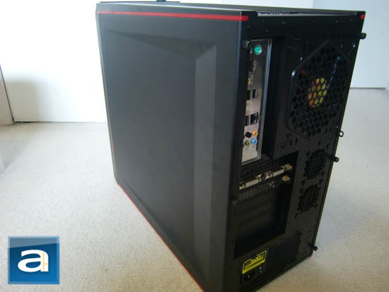The left side panel is physically identical as the right side panel -- without the addition of a 230 mm fan -- while retaining the trademark Element series red trim. This gives the chassis a very pleasing yet conservative look to it; with the red trim again reminding us that the case is designed with gamer appeal in mind. According to the retail packaging, this red trim material also provides a degree of sound proofing.