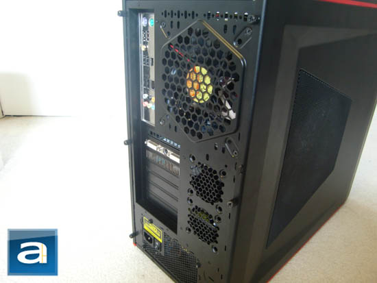 At the rear of the case, there is a single 120 mm fan located near the upper right. Unlike the other three fans in the case, this one is not equipped with any LED lights. This fan is placed in such a way that if you are using a tower style heatsink, any heat generated by it can be immediately removed from the case as implemented on many modern cases. Below that, we can see Thermaltake has given us the option of adding two additional 60 mm fans for more cooling capabilities. Underneath the I/O panel, we can see that the Element G features seven expansion slots, which should be more than enough for any full-featured motherboard. The top expansion slot is covered by a slotted panel held in by a single screw, while the other six below it are standard metal plates that you have to push out. It would be nice if Thermaltake included slotted panels like the uppermost expansion slot as the enthusiast is probably constantly changing parts. And once the standard metal plates are removed, there is nothing covering that expansion slot, should one leave it vacated.