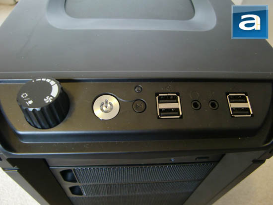 Along the top of the case, we can see the front panel connectors -- as well as the large silver colored power button, and the smaller black reset button. The buttons are designed in such a way that it would be quite difficult for one to press the reset button by accident.