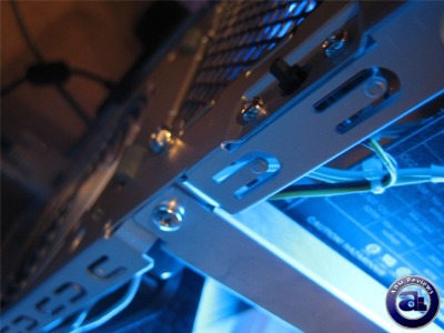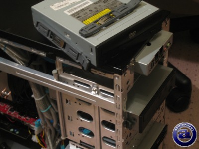 Although the requirement of removing the front panel in order to install optical drives maybe somewhat an inconvenience, the actual drive installation process is not. Simply put two supplied rails onto both sides of your drive, and slide it into place. I still like Coolermaster's implementation of tool-free drive installation on the Cavalier 1 which I purchased last year better, where you simply put a drive into place and slide a lock to lock the drive into place. Tool-free drive installation on the Thermaltake Matrix VX can still be completed in thirty seconds, however. Hard drive installation is nearly identical to optical drive installation.