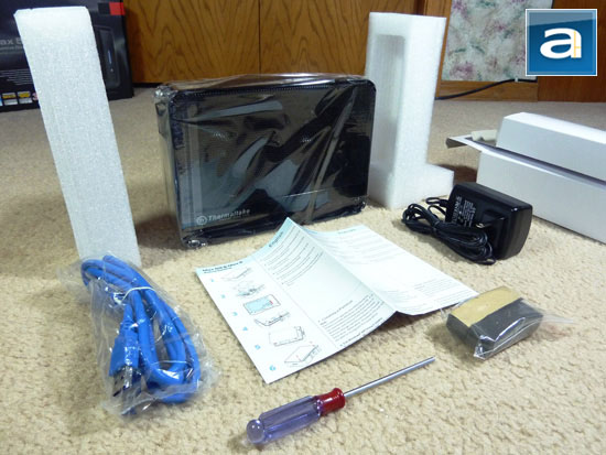 Opening up the retail box, I discovered the enclosure was well protected with two pieces of Styrofoam on either side. The other components were also safely stored inside white cardboard boxes. Pulling everything out of its packaging, you will be presented with the enclosure, a USB 3.0 cable, a power adapter and cable, a screwdriver, an instruction manual, and some padding. I do not suspect that many people will need to use the installation instructions, as the overall process is fairly intuitive. Just in case you get confused, rest assured as it is there for you with additional images. As mentioned in the features list, the Thermaltake Max 5G incorporates an integrated rotatable stand with rubber grommets at the bottom of the unit that adds stability. Unlike other enclosures that have a choice of exterior color, the Max 5G comes only in a black version. Overall, I quite like the look of the enclosure with the dark case and rotatable stand. Some might consider it a bit bulky; however, I would have to disagree, simply because this is not just a typical enclosure -- it uses active cooling. That basically means it should be placed in the open, which rules out the need for crunching it in tight spaces. Next, we take a look at the inside of the Thermaltake Max 5G.