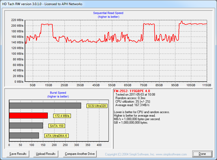 Yep, it did. There is no bottleneck right under 65MB/s as our previous graph seems to suggest. With the G.SKILL Phoenix EVO 115GB, you will notice some distortion on the graph. This is due to the fact SSDs show lower performance in HD Tach where data is physically present. If you look at the top line (Obviously this is where there is actually free space), you can see it is performing at around 205 MB/s. This is where the actual average is supposed to be; unfortunately, we do not have a blank SSD to test this on, so we will be using 205 MB/s as average. That is a very respectable figure posted by the Max 5G over USB 3.0. Just for reference, the G.SKILL Phoenix EVO 115GB's performance when plugged into a SATA port directly is 234.8 MB/s according to my colleague Jonathan's recent review.