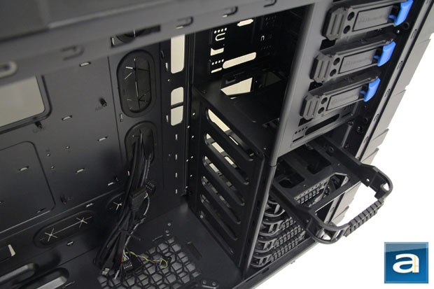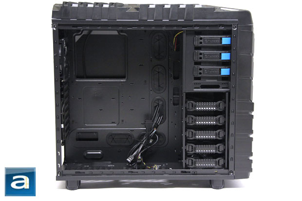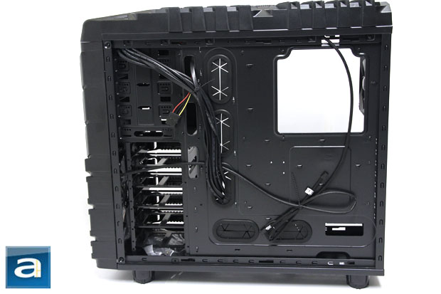 Removing the back side panel reveals one of the cleanest motherboard tray backsides I have seen. All the front panel wires are routed to the back of the motherboard tray, and are cable-tied neatly for the user -- straight out of the box. The front and top 200mm blue LED fan cables are also routed through here, and are tied down to the back of the motherboard tray, just liked the front panel wires. Both fan cables use a 3-pin connector. No more headers on your motherboard? No worries -- Thermaltake has provided two short 3-pin to Molex cable adapters in the accessory bags. Lastly, found all around the back of the motherboard tray are a lot of cable tie holes, as well as an immense amount of cabling room behind the hard drive trays. All cables are fully sleeved for a nice finishing touch.