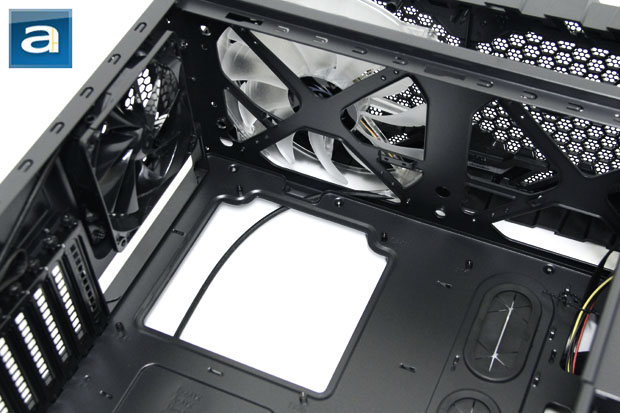 Below the top fan is a very small opening just above the motherboard tray; perfect for routing the motherboard power cable, and the such. I would like to see the hole increase in size, since many cables, such as power, fan, and even HD audio may find its way through here to plug into the motherboard. Hence, such a small cable hole falls short in my opinion. On the other hand, below is a huge opening on the motherboard tray for users to easily install aftermarket CPU heatsink backplates. The hole is actually quite large to accommodate motherboards of different generations.