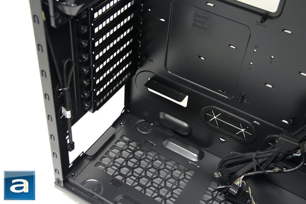 Just above the bottom mounted power supply bay are eight expansion card slots. The expansion slots use thumbscrews to secure the slot covers and add-on cards. Along with the system seen in the 5.25" drive bays, Thermaltake has made the Overseer RX-I a fairly tool-free case, which is great for users who find this extra convenience beneficial.