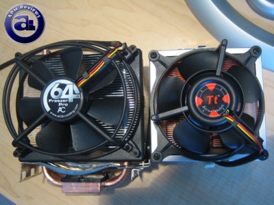 A size comparison with the Arctic Cooling Freezer64 Pro heatsink. Both products retail for around the same price, but the Arctic Cooling Freezer64 Pro has six heatpipes, a larger 92mm fan which is designed to be positioned ninety degrees to CPU. The Thermaltake RX-K8 has taken a more traditional approach; having a 80mm fan pointing down at the CPU with no heatpipes -- the overall design of this heatsink seems to be very similar to a stock heatsink. Ironically, even the latest Athlon 64 X2 stock heatsinks boasts a couple of heatpipes.