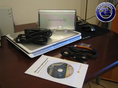 Out of the box, you will receive the Thermaltake Silver River DUO itself, stand, a USB cable, an eSATA cable, power cable for connection with power brick (Included), manual and driver CD for legacy operating systems, internal IDE and SATA adapters (With power adapters), four screws, and most interestingly, a screwdriver. Now that's really usable out of the box -- you don't even need to worry about the screwdriver. How useful!