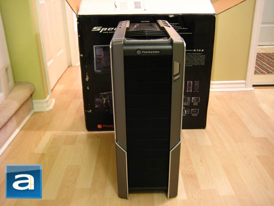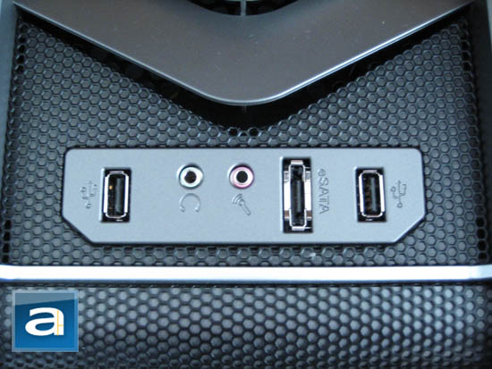 At the top of the Thermaltake Spedo Advance, placed near the front panel of the case are the "front" panel connectors. The usual dual USB ports, 3.5mm speaker output, and a 3.5mm microphone output comes in standard, like all modern chassis. Where a Firewire port is usually located is dropped in favor of an eSATA port. There is no cover for these connectors, so it could become easily be seeped with dust -- especially when they are located at the top of the case. Just make sure to have some extra dust spray ready. Fins are located at the top along with another 230mm fan to correspond to the 230mm fan installed on the side panel window.