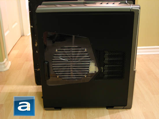 The right side of the case is just about the same as the its opposing side, except fitted with a mesh vent for an optional 120mm fan -- which enhances cooling at bottom of the motherboard. A mesh cutout designed for the hard drives are also located in the same place as it was in on the flipside of the case. Overall, both sides of the case are nearly symmetrical; and creates a look that is pleasing to the eye.