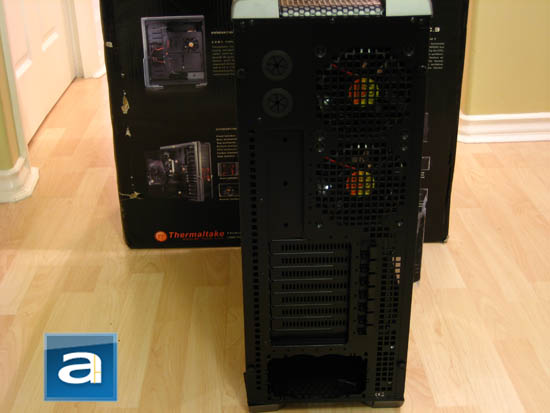 As the Thermaltake Spedo Advance Package computer case is water-cooling ready, the back of the case has the usual cutout holes for an optional liquid cooling system; which is located at the top left of the rear of the case. To the right side of that are the two 120mm fans used to exhaust the heat generated from the hot hot (temperature) beastly components that usually ends up installed in this computer case. There are four thumb screws that keep both of the side panels in place, and are placed so the user can remove the side panel without grabbing a screwdriver every time. Located right below that is where the I/O shield is designed to go. There are seven expansion card slots, with a unique screwless installation system; all you have to do is push down the button and remove the metal dummy plate. Then insert the expansion card, and push the lock back in. That's it! Finally, the power supply nay is located at the very bottom of the case (Which is below the motherboard, if that's not becoming obvious haha), which is becoming quite common nowadays for thermal management advantages.