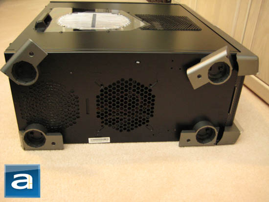 Four plastic feet are attached to the sides of the bottom of the case. They swivel to allow the feet to be aligned either parallel or perpendicular to the case. This means that the case is able to adapt to surfaces requiring different stability/balance specifications -- ranging from carpet to tile. There is an additional mesh vent at the bottom of the Spedo so another fan can be added to the bottom of the case (Not recommended, especially if your computer is placed on the floor!). The PSU also gets a vent for airflow to bottom-mounted 120mm fans too.