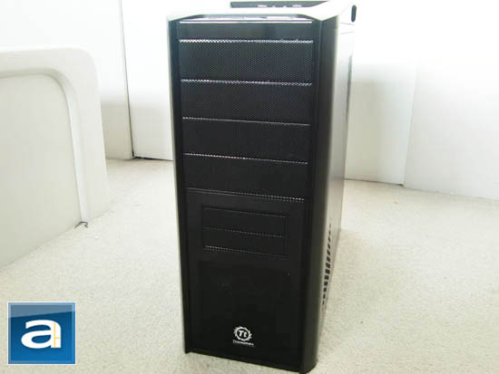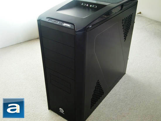 On the outside, the V9 Black Edition (From here on referred to as the V9 Black) shares a shocking resemblance to the Antec Nine Hundred. And understandably so, as the Nine Hundred is one of the most well rounded mid tower gaming cases available. Measuring 46.2cm tall, 20.8cm wide and 48.5cm deep, the V9 Black is a decent size case. One problem I can see right now is that with only 20.8cm of width, there might be some issues with the side panel fan interfering with the installation of some taller tower style heatsinks such as the Noctua NH-U12P, or the Thermalright Ultra 120 Extreme. Like most cases on the market nowadays, the V9 Black is constructed out of black SECC (steel, electrogalvanized, cold-rolled coil) and plastic. Its primary SECC construction gives the V9 Black a cross between aggressive looking gamer cases, and conservative looking mainstream cases. The front of the case features four 5.25" drive bays, as well as two externally accessible 3.5" drive bays. This is excellent for those who still want to install a floppy disk reader or a 3.5" internal card reader. At the very bottom of the case, just behind the Thermaltake logo, is a 120mm fan with red LEDs providing intake airflow via the front panel; this fan is powered by a single Molex power connector (As are all other fans in the V9 Black). While we are here, the front panel construction is mostly composed of plastic mesh. Each of the 5.25" and 3.5" drive bay covers feature a foam dust filter. The front construction of the case is again black colored metal mesh, with holes for easy ventilation and low air resistance intake.