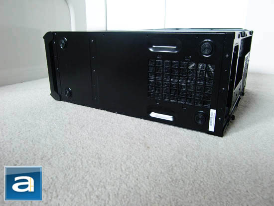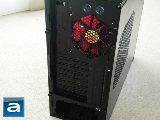 Toward the rear of the case, at the very top, we find two holes for water cooling tubes -- one for inlet, and one for outlet. This is a nice addition to a gamer oriented case, as many enthusiasts will be evoking the use of water cooling. One glaring disadvantage that I found right away is that these holes are not exactly wide enough to fit water cooling tubes with a larger diameter. And it would have been nice for Thermaltake to make these covers out of rubber instead of plastic. Below that, we have a single 120mm exhaust fan. Like the other two 230mm fans in this case, the 120mm exhaust fan at the rear of the V9 Black is not LED lit. This fan is placed in a position that, if you are using a tower style heatsink such as the Noctua NH-U12P or the Thermalright Ultra 120 Extreme in a front to back configuration, the heat drawn away from your CPU by these heatsinks will be dissipated into the air and removed from the case interior. To the left of the fan, we can see the standard I/O panel. Below the standard I/O panel are seven expansion slots, which is sufficient to compliment all ATX motherboards. What I had hoped Thermaltake would include are replaceable expansion slot covers, but instead the V9 Black features the cheaper punch out plates. One obvious problem with this is that if your system configuration changes, and you happen to leave an expansion slot that's previously used vacated, there will be a hole there. Lastly, at the very bottom of the case is the power supply mounting location.