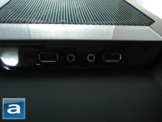 What we have at the very top of the case, just in front of the 230mm top exhaust fan, are the front panel connectors. Thermaltake has opted for two USB 2.0 ports, as well as front panel headphone and microphone output/input jacks in this location. It would have been nice for eSATA or Firewire to be featured, as those two are basically standard in many cases on the market today. The front panel connectors were relatively easy to install; but like the Thermaltake Element G, the front panel connector pins were not labeled positive or negative. In future implementations, it would be nice for the front panel connectors to be labeled for more user friendliness.