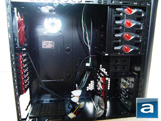 With the left side panel removed, the interior workings of the V9 Black are revealed. For a smaller mid tower case, the V9 Black has quite a bit of room on the inside to work with your components. However, what I find lacking immediately are holes for cables to be routed behind the motherboard tray. As we move on towards motherboard mounting mechanisms, you can see that there are six integrated ATX motherboard stand offs. If you are using an ATX motherboard, you will not need to install any motherboard standoffs as those are integrated into the chassis itself already. As a side note, the motherboard tray on this particular case is not removable -- just to note, as this is not out of our expectations. The V9 Black has support for up to and including 10.5" video cards. Any cards longer than that, such as the recently released ATI HD 5870, may not fit. At the very bottom, as stated on the previous page, is the power supply bay. Thermaltake has included a bottom dust filter to filter out any dust that may be on your desk, and could potentially be drawn into your system. We can also see that all of the fan cables are sleeved, save for the front panel connector wires. It is kind of strange that they would go through the trouble to sleeve the fan cables, but neglect to sleeve the front panel connector and USB connector cables. All in all, it;s quite a standard ATX case layout.
