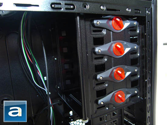 At the top right of the V9 Black is a 5.25" drive mounting mechanism. It is apparent that it is a 100% tool-free installation system. All you have to do is turn that knob 180 degrees, insert your 5.25" drive, insert the locking mechanism, and turn the knob 180 degrees in the opposite direction to lock it again. Despite my dislike for some tool-free installation systems, as often times it isn't quite secure enough, Thermaltake has done a very good job here in designing a mechanism that mounts my DVD writer very securely. Below that, we have the external 3.5" drive bays. Unlike the 5.25" drive bay, this does not feature tool-free installation mechanisms.