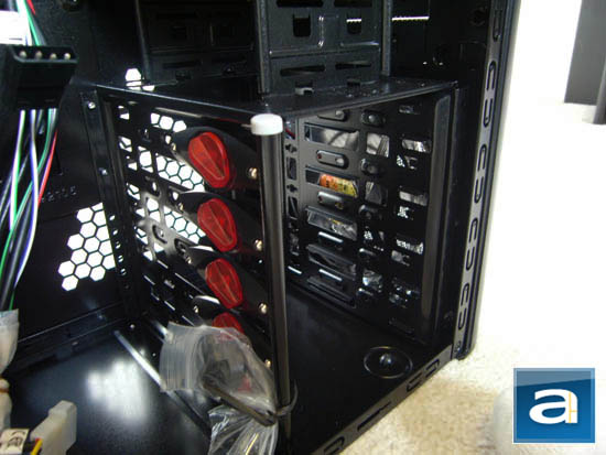 At the very bottom right behind the front 120mm intake LED fan is the internal 3.5" drive bay. The V9 Black allows you to be able to install up to five 3.5" internal drives, which for me is more than enough. But keeping those with more than five internal 3.5" drives in mind, what I think would have been a better setup would be, instead of having two external 3.5" drive bays, extend the internal 3.5" drive bays up, and increase support one more internal drive. Like the 5.25" drive bays, the 3.5" internal drive bays features a tool-free mechanism, with essentially is the same design as the above. Although secure enough, I found that the hard drives are only secured on one side with this mounting mechanism. It would have been nice for Thermaltake to somehow design it so that the drives are secured from both sides. As well, there is no support for any 2.5" drives. So if you happen to have a 2.5" HDD or SSD, you will need to purchase a 2.5" to 3.5" drive adapter.