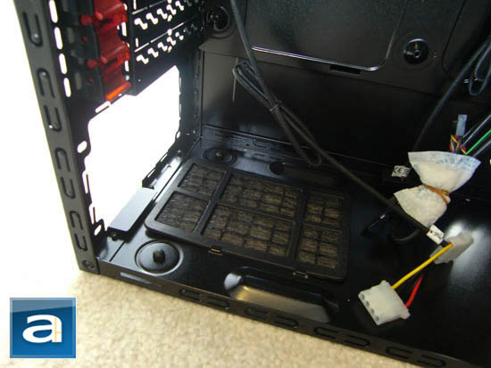 As mentioned before many times, the V9 Black features a bottom power supply bay location. Thermaltake has included a bottom mounted dust filter to prevent dust from being drawn into the case from the bottom. I noticed that they also have risers at the bottom to give the power supply some clearance between the bottom panel. What that allows is just a bit of space for the fan to intake air, instead of having the power supplies with bottom mounted 140mm fans to flush with the lower dust filter.