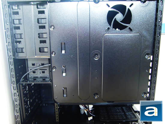 As we turn the case around and take a look behind the motherboard tray, what we find lacking immediately are two things. Firstly, holes for cable management are not present, as aforementioned. This means that when your bottom mounted power supply needs to reach the 4-pin ATX/8-pin EPS connector -- usually at the top left of the motherboard -- what you will need to do is run the CPU power connector from the bottom of the case, over your video card and maybe even over your heatsink. Secondly, what we see at the top right, where the back of the CPU socket is supposed to be, is a hole for a 70mm fan to be mounted. In order for your back side panel to be able to close, this 70mm fan will need be a low profile one. As Thermaltake has opted for the 70mm fan mounting spot, there is no cutout on the motherboard tray for any CPU heatsink back plate installation. If you need to add/change your CPU heatsink backplate, you will need to remove your motherboard altogether.