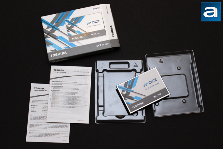 Out of the box, we have a pretty standard set of things, which is not much. The Toshiba OCZ TL100 240GB is enclosed in a plastic tray to ensure nothing rattles around in the box. There are also two pieces of documentation, which has information about usage for the drive and warranty contact numbers. Just to note, the Toshiba OCZ TL100 240GB comes with three years of Toshiba's Advanced Warranty Program, which is one of the easiest warranty systems to go through, though I hope you will never need to.