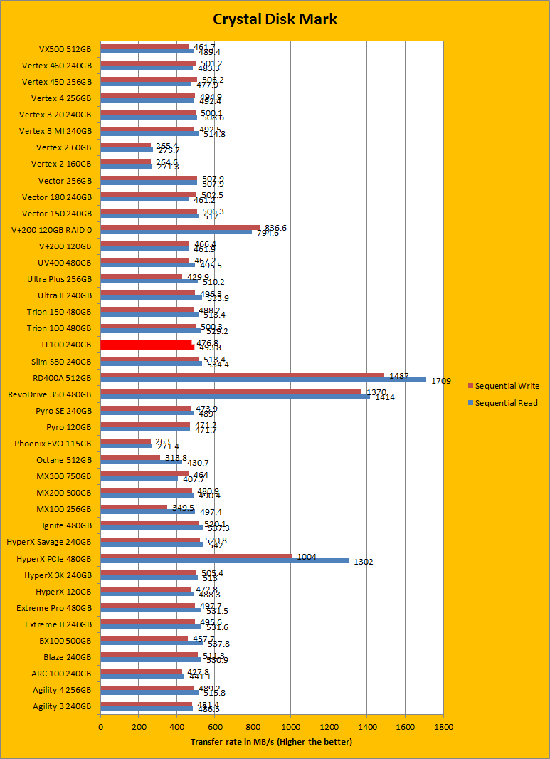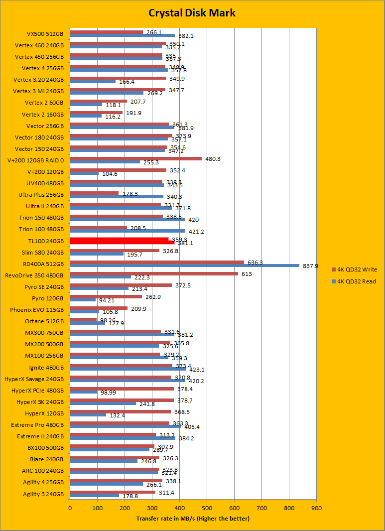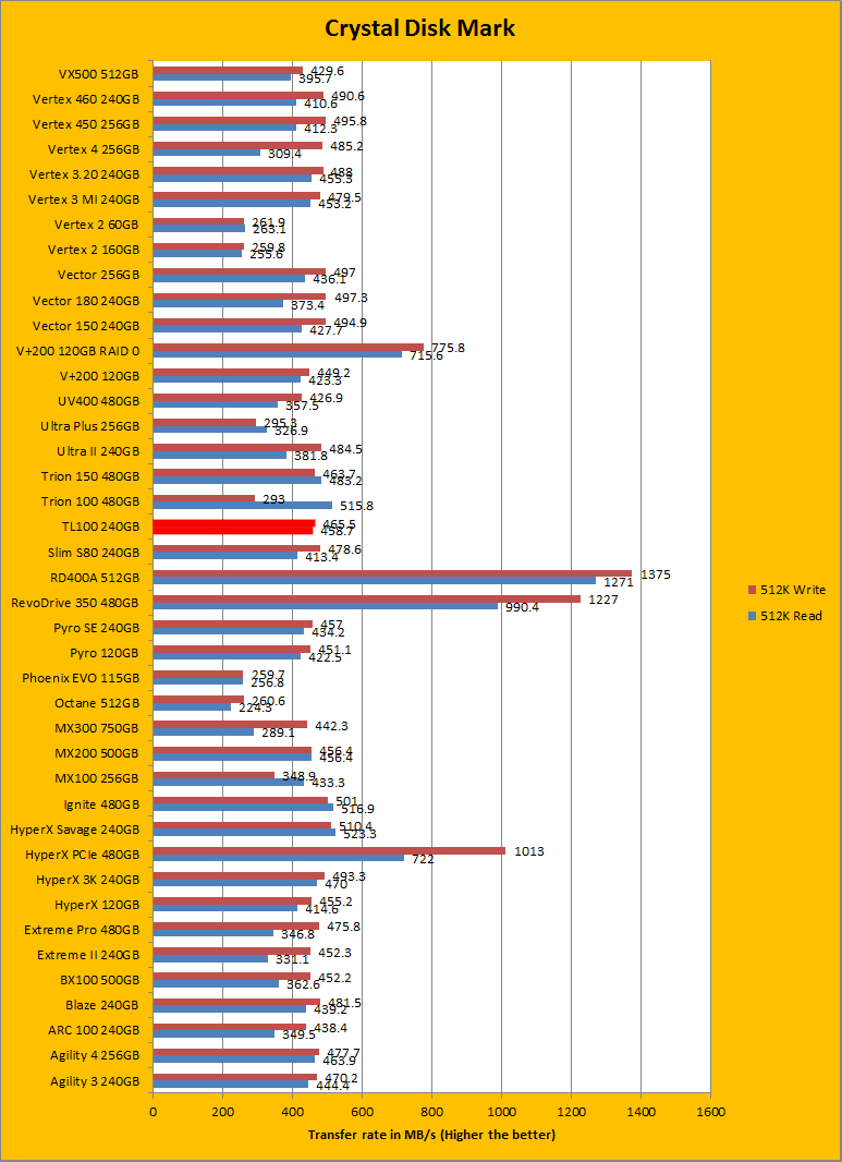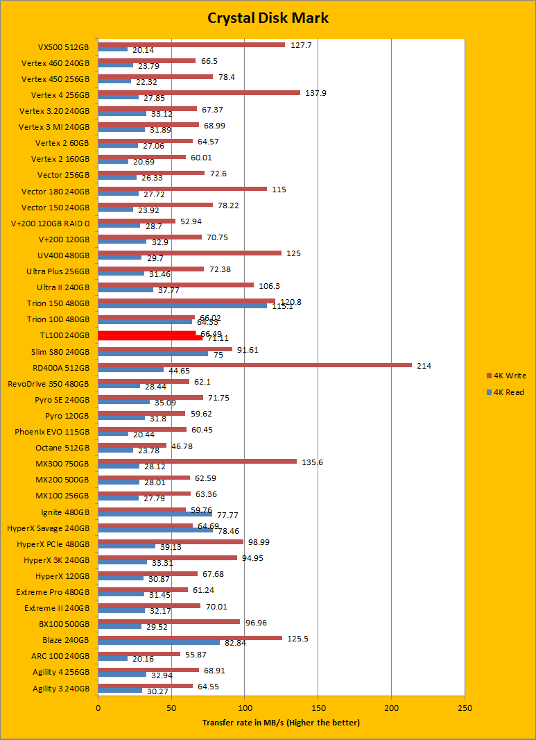 Moving to Crystal Disk Mark 3.0, this is another one of tests which to me are the easiest to produce, and provide numbers in a timely manner, unlike our last benchmark, the PCMark 8 consistency tests. Just a bit of background information; higher capacity drives tend to perform a little better in these tests. The ability of a controller and flash memory to deliver high IOPS will provide huge benefits to the score as well. The Toshiba OCZ TL100 240GB is rated at 85,000 IOPS read and 80,000 IOPS write. Taking a look at the results, in sequential and 512K write and read, the TL100 was in line with the Trion 100, Trion 150, and the UV400. As for 4K write and read, the Trion 100 and TL100 are most similar in results. In the 4K QD32, again we can see the numbers trade blows back and forth when comparing with the other Toshiba OCZ drives in this area, with the TL100 240GB coming out on top for write, while falling behind for read. It should be noted the two Trion SSDs were double the capacity of this one, which could have played a factor in these results. Otherwise, you can see the other results and compare them to previous drives above.