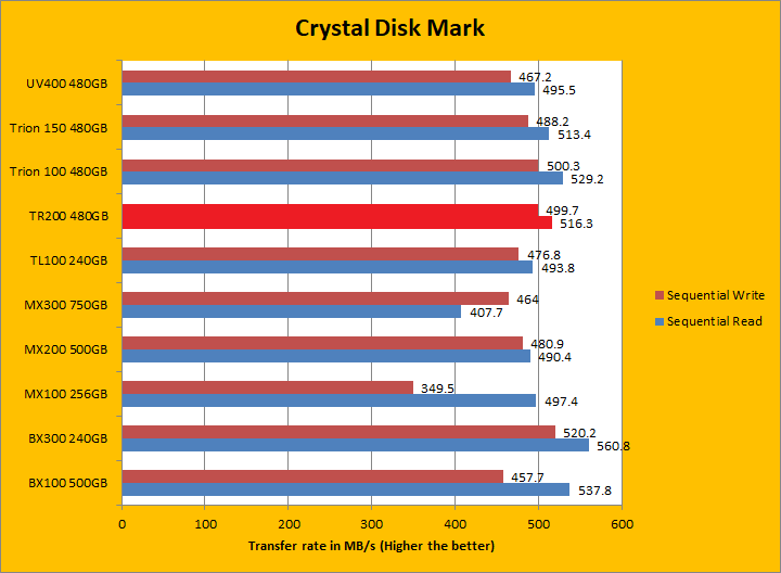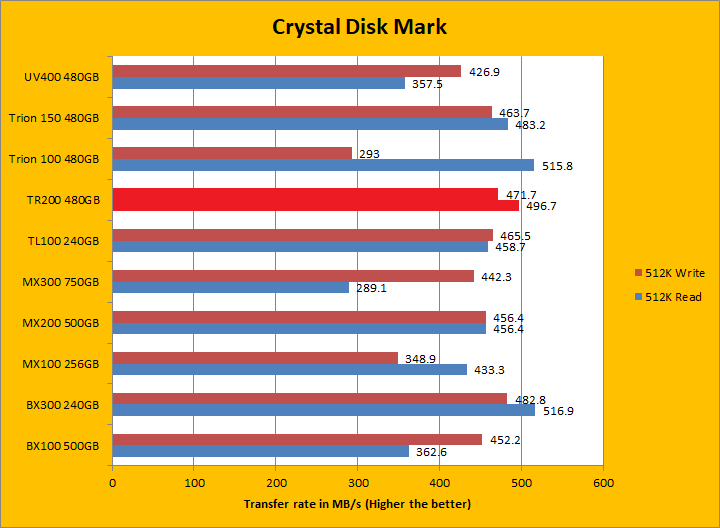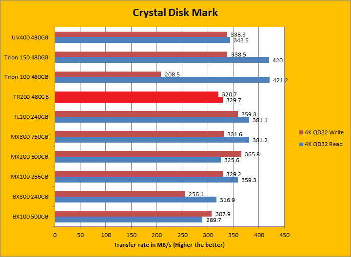 Crystal Disk Mark 3.0 is in the spotlight. Just a bit of background information; higher capacity drives tend to perform a little better in these tests. The ability of a controller and flash memory to deliver high IOPS will provide huge benefits to the score as well. The Toshiba OCZ TR200 480GB is rated at 82,000 IOPS for read and 88,000 IOPS for write. Its read rating is slightly lower than the TR150, but the write rating is considerably improved. Looking at the results, the TR200 edged out the TR150, TL100, and UV400 in every category other than 4K QD32, where it fell behind all three. Conversely, Crucial's BX300 was faster than the TR200 in the first three tests, and fell behind the TR200 in the last one. I will let you make your own comparisons in our list of budget SSDs in the graphs above.