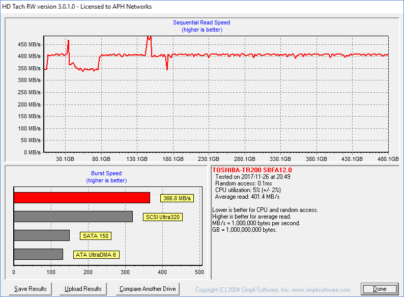 After giving the Toshiba OCZ TR200 480GB a clean format and ensuring alignment and everything is correct, I fired it up for some testing in HD Tach. While HD Tach is more of a 'drag race' than a clear indication of real life performance, and has been around for a really long time, it is an excellent storage performance reference among SSDs with the same controller, and has been our favorite benchmark long before hard drives even cracked the 50MB/s mark. With an average read speed of 401.4MB/s according to HD Tach in single disk configuration, this is a pretty good place to be at; edging out both the Kingston UV400 480GB and Toshiba OCZ TL100 240GB. However, it was slower than the Crucial BX300 240GB and OCZ Trion 150 480GB. For most solid state drives, we typically look for something that is faster than 350MB/s. From our experience, many drives do not crack the 400MB/s line. At the end of the day, HD Tach may not be the best test for solid state drives all the time, but these results are always interesting to look at.