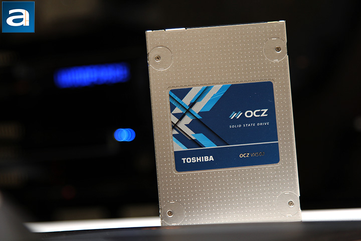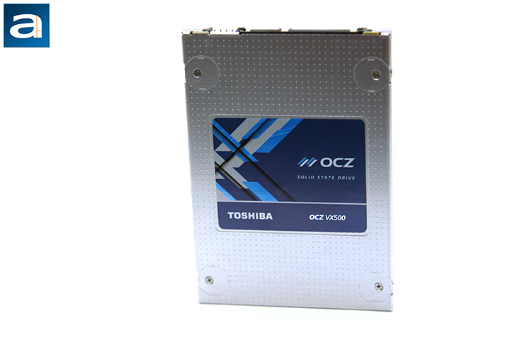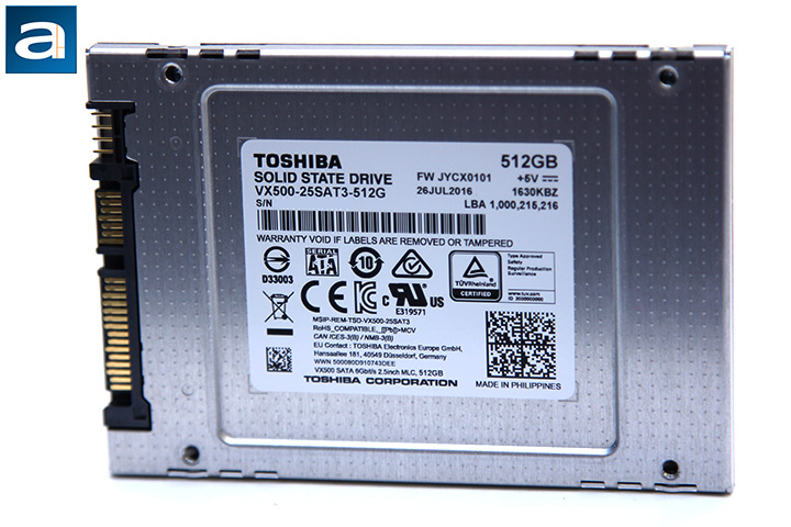 As always, before we move onto the fancy technical details about Toshiba's latest mainstream performance solid state drive based on their in-house TC358790 controller, let us briefly discuss the physical attributes of this SSD first. The VX500 512GB looks nothing like anything we have seen under the OCZ brand before, but those who are familiar with their parent company's enterprise grade drives will find it very familiar looking. The Toshiba OCZ VX500 512GB uses the same metal casing as the Q300 Pro, which features a sleek industrial look. The front is a dotted metal plate with a label in the middle. It is vertically oriented, and gives the Toshiba OCZ VX500 512GB a clean and modern look. You can discern between product lines based on the color scheme used. This predominantly blue label is present to ensure the user will make no mistake that this is a VX series drive -- where 'VX' is short for 'Vertex' -- but you will not find its capacity until you look at the back.