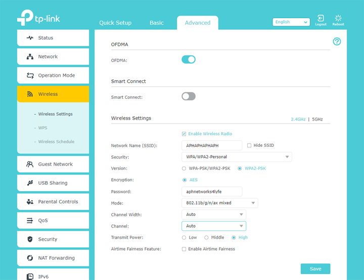 In Wireless, you can make similar changes to the one in the basic section, but you can also change the security settings, wireless modes, channel and its width, as well as the transmit power. These options are available for both the 2.4GHz and 5GHz networks. You can also make WPS settings changes and setup a schedule for enabling or disabling the wireless networks. At the very top, you can also enable or disable OFDMA as well as Smart Connect, which combines the two networks into a single one for better compatibility on more devices.