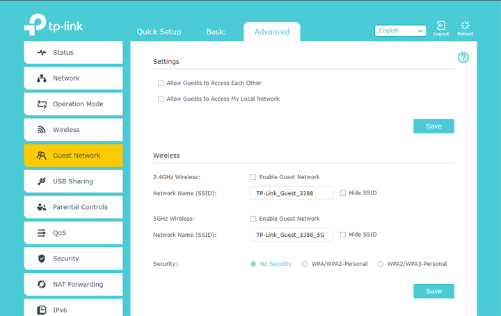 The Guest Network page is similar to the basic one, but there are a few more specific settings like changing the security type for the guest network. You can also change whether or not you want guests to see each other and/or access the local network. I would have liked to see some more settings here, such as an automatic timeout or limits to bandwidth here.