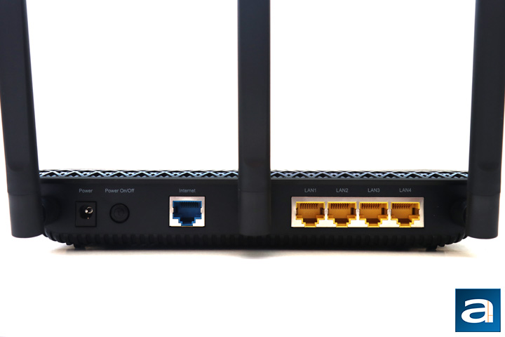 Turning the TP-Link Archer C2300 around, we can take a closer look at the three dual band antennas attached to the router, all at the back, along with some of the ports and switches. These antennas are matte black with zero other logos engraved. As for the ports, from left to right, we have a 12V DC power input, a power switch, one Gigabit uplink port, and four Gigabit Ethernet ports. The rest of the inputs and outputs can be found on the left side of the device, as we will see soon enough.