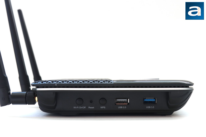 Just like its bigger brother, the TP-Link Archer C2300 includes more inputs and outputs on the left side of the router. On this side, we have a switch to toggle the Wi-Fi on and off, reset pinhole, Wi-Fi Protected Setup button, USB 2.0 port, and a USB 3.0 port. These ports can be used for plugging simple devices like flash memory. Personally, I like the fact TP-Link placed these ports on the side, as these ports and buttons are more frequently accessed than the ones at the back, and should be easier to access at this location.