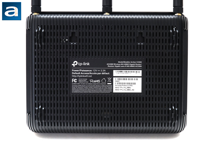 From the underside, you can see more of the TP-Link Archer C2300's ventilation holes. Four plastic feet can be found protruding out here with one in each corner. These lift the bottom of the router off the ground by about half a centimeter. It would have been nice to see more clearance, as laying the router on any softer or plushier surface will mean these vents will not have a lot of airflow. I sometimes found the router getting a bit warm when resting the router on carpet rather than a hard surface, though the extra heat should not be too concerning. There are also two wall mounts to let you hook the Archer C2300 off the ground and onto the wall if you so desire. A label exists in the middle to display information like the serial number, default SSID, as well as the default wireless password. Obviously, you can change these later on, but these are the defaults for getting started. The link to the configuration page for this router can also be found on this sticker.
