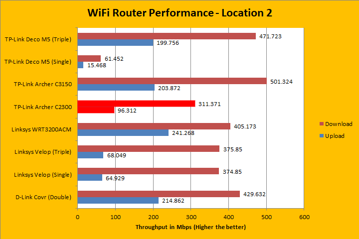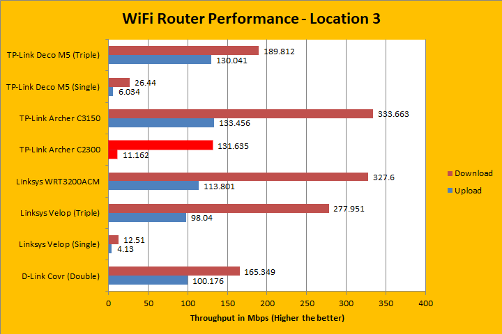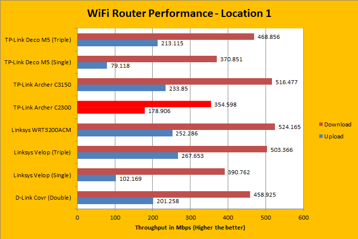 Overall, the performance of the Archer C2300 was not the best we have seen, but it was not completely unexpected either. I would have expected similar performance numbers between this and the single Linksys Velop, though there were blows traded throughout the locations. Download speeds peaked at 354Mbps, which is lower than expected. Upload speeds of the Archer C2300 also seemed to be weak overall relative to its speed rating. At locations four and five, these numbers are below what I would have expected for an AC2300 router with three high gain antennas, despite putting up acceptable download numbers.