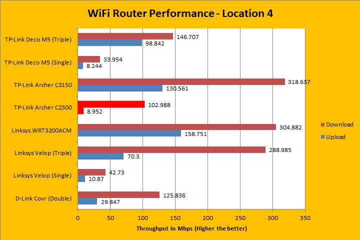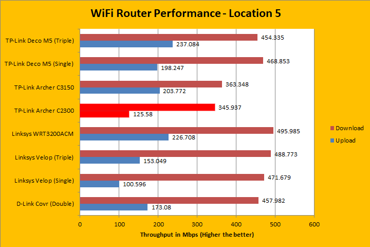 Before we continue, I should note this is an AC2300 spec router, so this is the slowest non-mesh network router on paper and should be compared as such. In the first location, both the TP-Link Archer C2300 provided some reasonable performance. Compared to a single Deco M5 node, the download speeds were slower, though the upload speeds were quite a bit faster. Otherwise, I would have expected slightly faster download numbers, considering the Linksys Velop is operating in a similarly configured setup of AC2200. In the second location, the Archer C2300 yet again had slower download speeds when compared to the Velop, though it also had faster upload speeds. Compared to the single Deco M5, you can see how the antenna design is far superior, though this is not too surprising considering how compact the aforementioned router is. As this location was located directly above the router, this shows the antenna array strength above the router too. The third location follows a similar trend, with numbers being quite slow. It was definitely faster than the single Deco M5 or Velop, but the third location seems to be an Achilles' heel, with generally poor performance. Part of this can still be attributed to the power attenuation through a thicker garage wall, but even relative to its speed rating and antenna design, I expected something better. At the fourth location, which is a level down and again not in the line of sight of the router, we have even slower numbers between this and the previous location. Finally, in the fifth location, which was right under the router, the Archer C2300 provided relatively similar results compared to the other tested routers.